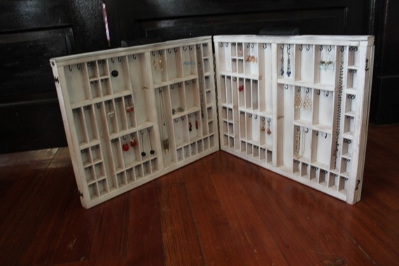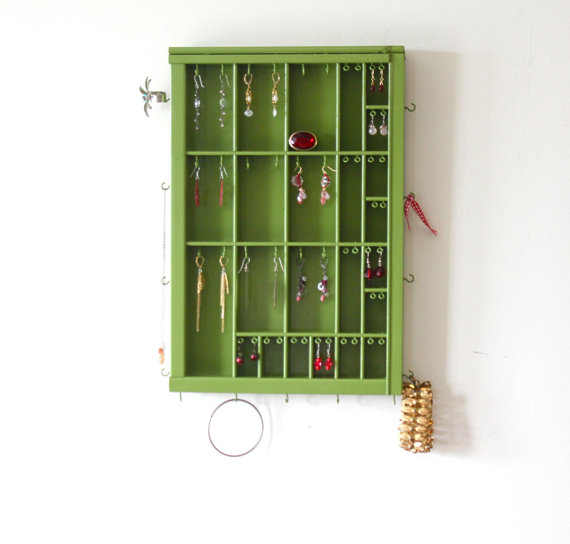 Enter Jessica Farmer, of the Etsy store Bluebirdheaven, with her ingenious solution.  She makes beautiful, display-worthy jewelry storage pieces out, wait for it, vintage printer’s drawers.  What a great idea!