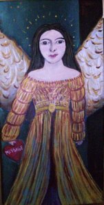 Her artwork lives somewhere in the neighborhood of folk art but with an edge.  When she makes a piece depicting a face — human or angel — I find that I can’t look away.