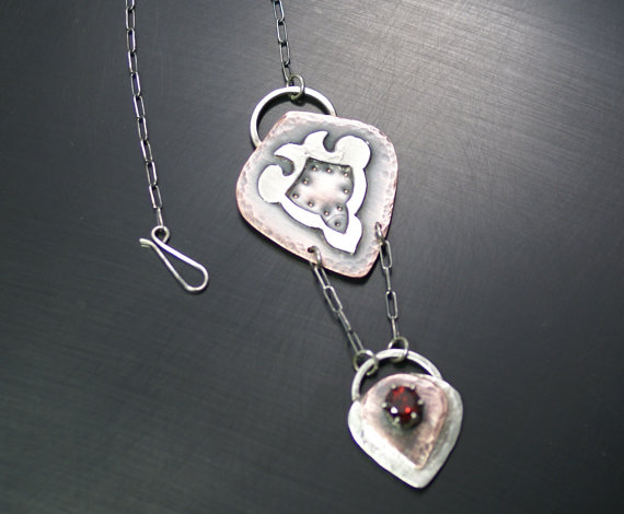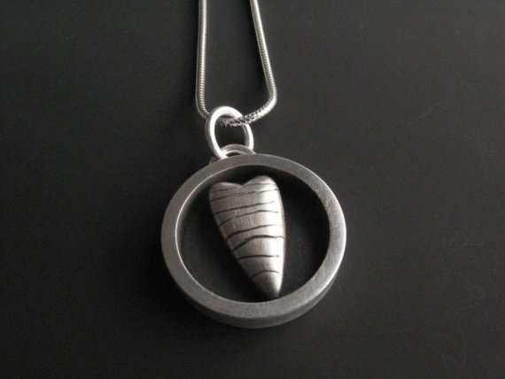 Perhaps, the more common the shape, the bigger the challenge it is to breathe new life into it.  Sandra has managed it with the heart.  Her designs are dynamic and eye-catching and wearable.  The great pieces featured here and more are available in her Etsy store, slradornments.  Just in time for Valentine’s Day.