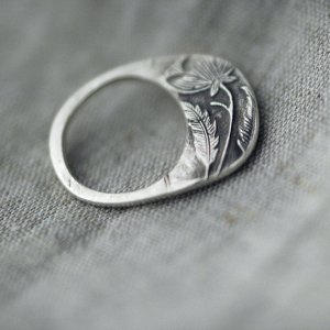 This ring, made of silver and a tiny diamond, has been a fixture in my life ever since.  I just love its suspended, single point of light.  I had long since lost track of the jeweler (or should I say jeweller) who made this piece so, in order to write about it, I had to engage in some detective work.  The maker’s mark on the inside is JJN.  With the help of the oh-so-handy, Wayback machine, I found that several years ago Argenteus sold James Newman‘s line.  While I don’t see my ring exactly in his current line, I am almost sure from his style (and initials) that I have rediscovered this wonderful designer.